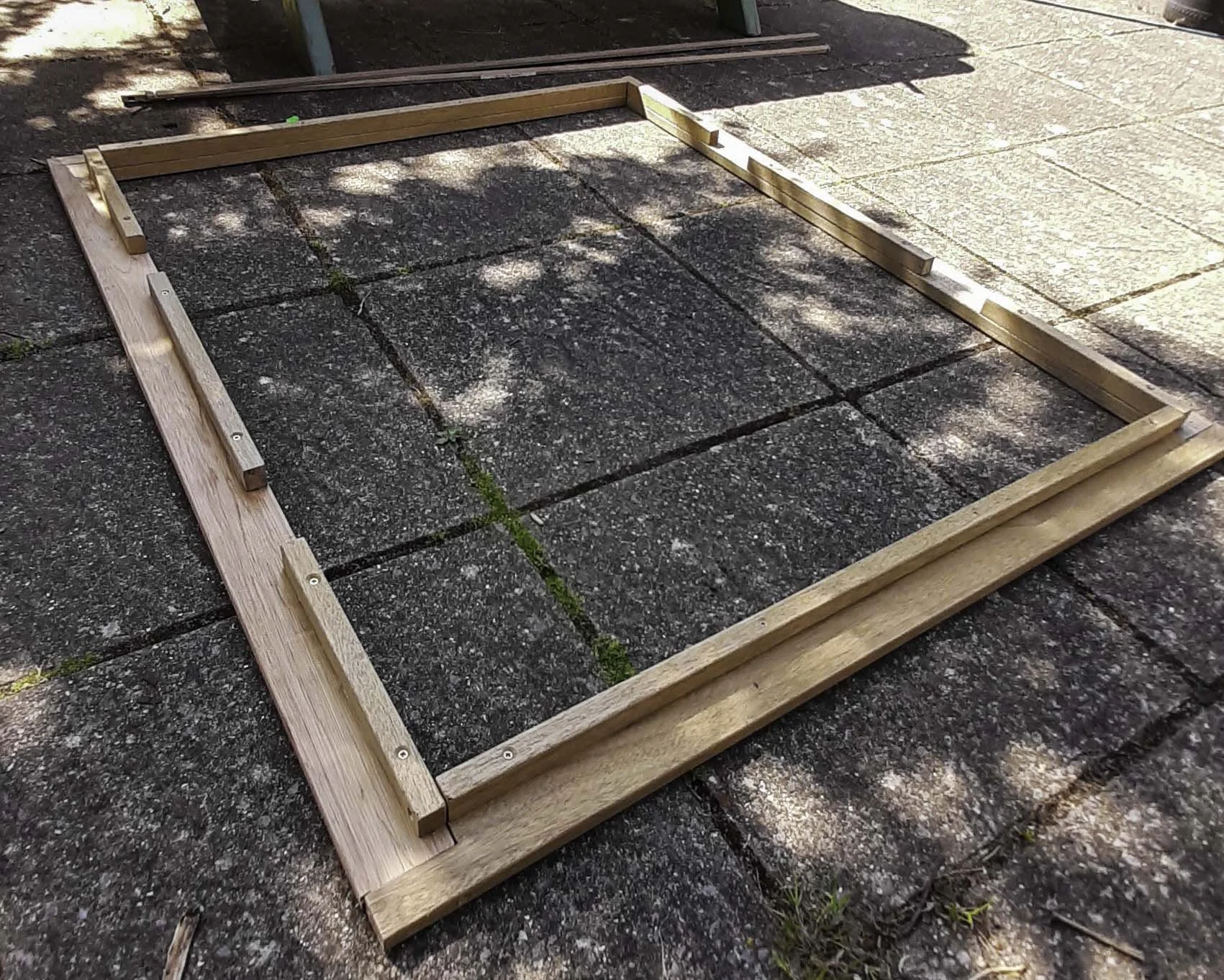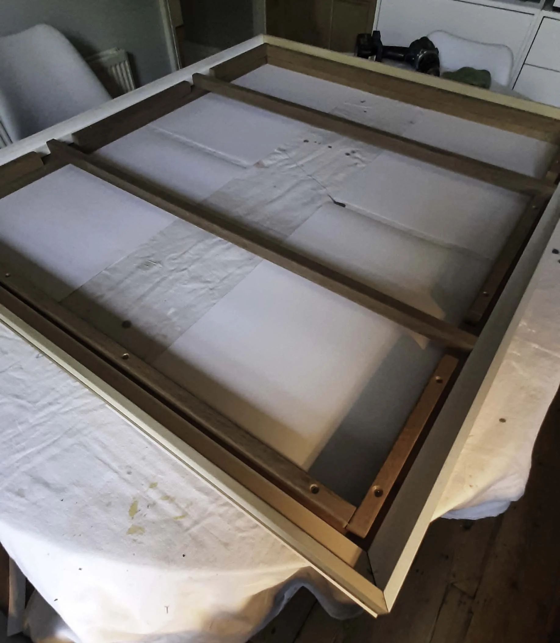 Two choices. Build a new frame, stronger, heavier. Or find a way to pull this one back into shape. The second option felt right. Less waste. More ingenuity. Oak bed slats—reclaimed from the local recycling center—became the solution. A hidden support frame sitting behind and within the tray frame, forcing them straight, locking them in place.